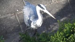 Dit is Mopje, een reiger die niet genoeg kan krijgen van de stukjes worst die hij krijgt van de Dordtse Danielle Smits. Echt een huisdier is het niet, maar Mopje ...